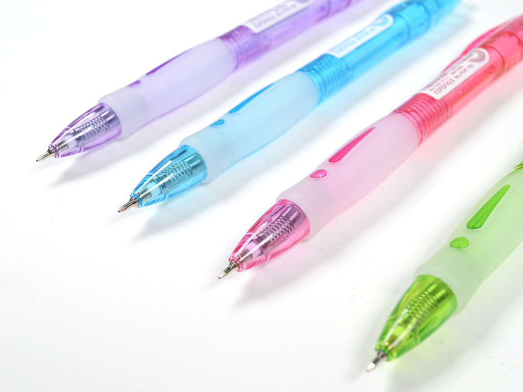 A retractable ballpoint pen with bright colours and comfortable rubber finger grip.