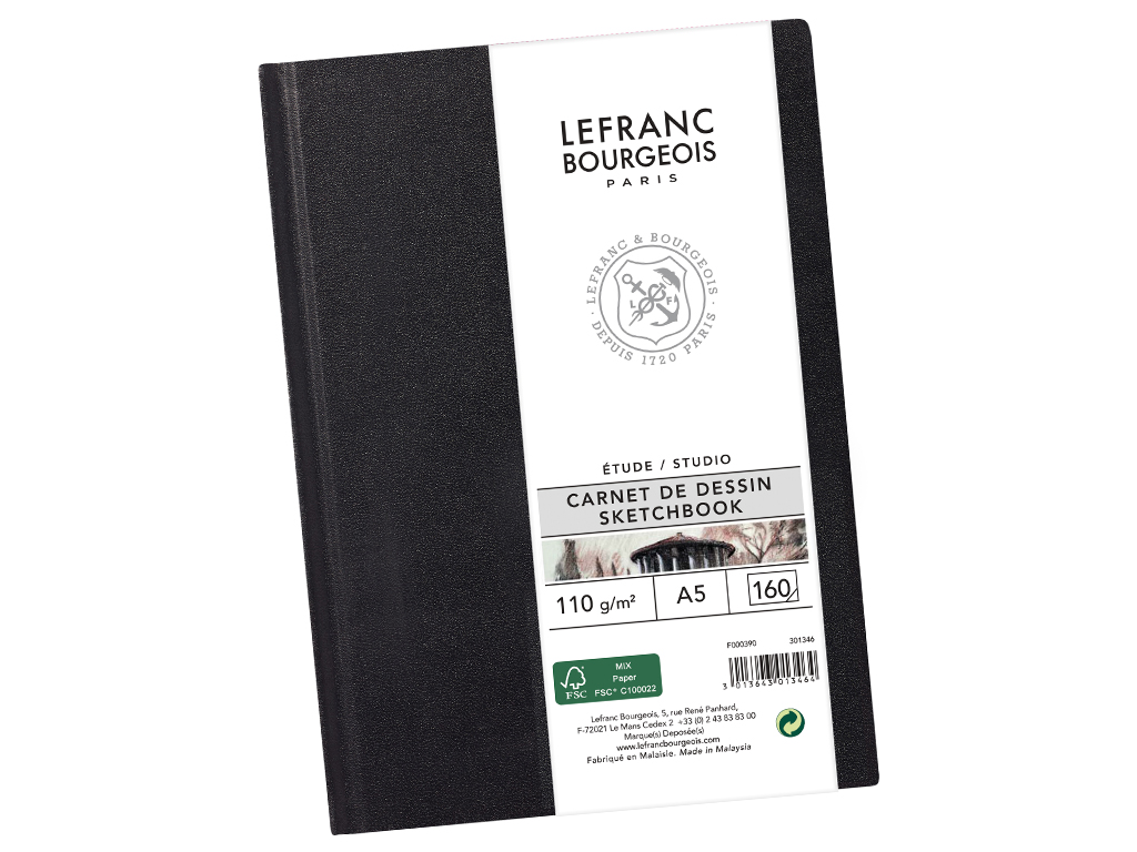 Lefranc Bourgeois Studio sketchbooks are made using sustainably sourced (FSC-certified) white 110gsm paper that works beautifully with pencils, charcoal, and inks. The stitch binding ensures durability, while the sturdy black PVC cover protects your artwork and provides a firm surface for drawing on the go. Also suitable for writing and taking notes.