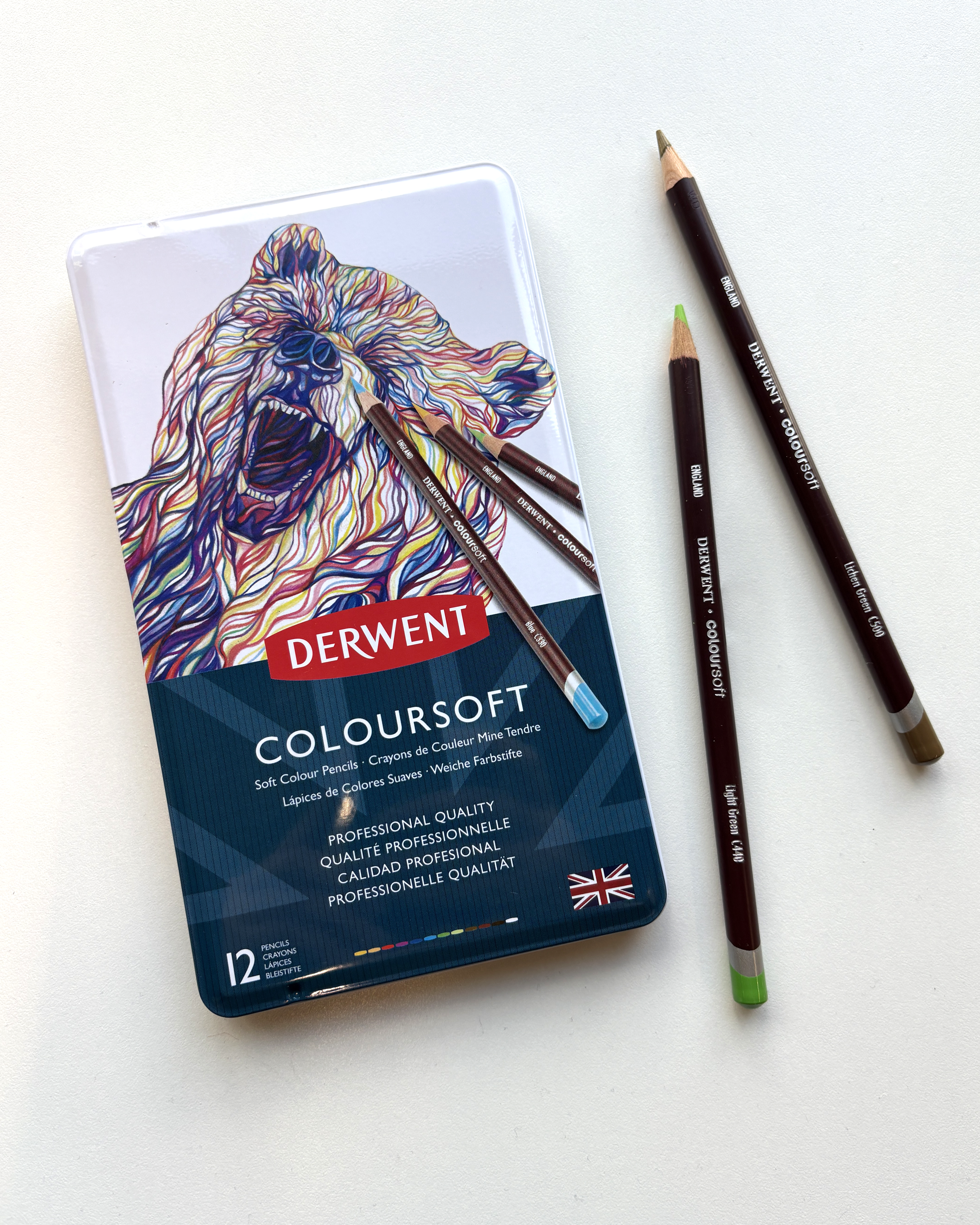 Kaip matome iš pavadinimo, spalvoti „Derwent Coloursoft“ pieštukai turi minkščiausią šerdelę. Šie pieštukai sklandžiai slysta popieriumi, jų spalvos yra intensyvios ir nepermatomos. Todėl jie itin tinka dideliems plotams padengti ir spalvoms maišyti – peizažams, portretams ir kūrybiniams eskizams. Minkštų pieštukų spalvas galima lengvai paskirstyti ir sluoksniuoti, todėl jie yra puikus mėgstantiems eksperimentuoti su spalvų sluoksniais ir norintiems sukurti tapybišką efektą menininkams.