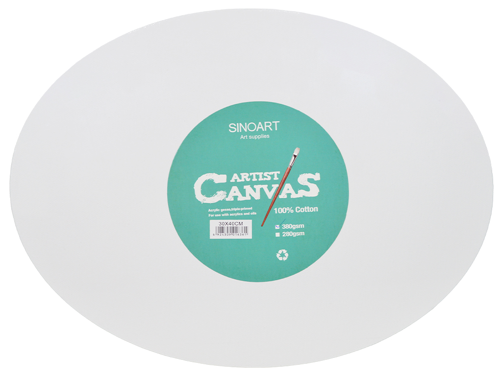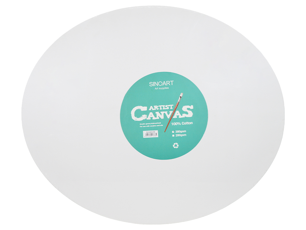 „Sinoart“ ovali drobė pagaminta iš 100% medvilnės ir tris kartus padengta akriliniu gruntu, kad dažai gerai sukibtų su paviršiumi, kuris yra tvirtas ir vidutinio šiurkštumo. Puikiai tinka tiek akrilui, tiek aliejiniams dažams. Įtempta ant MDF rėmo. Storis: 1,8cm.