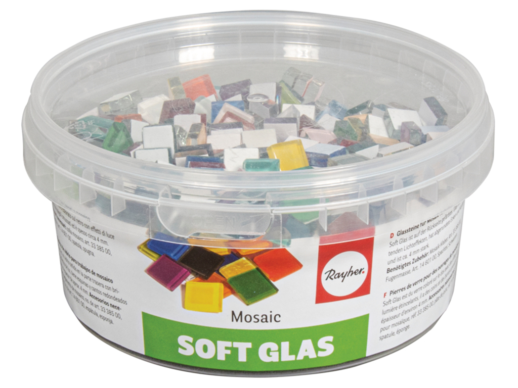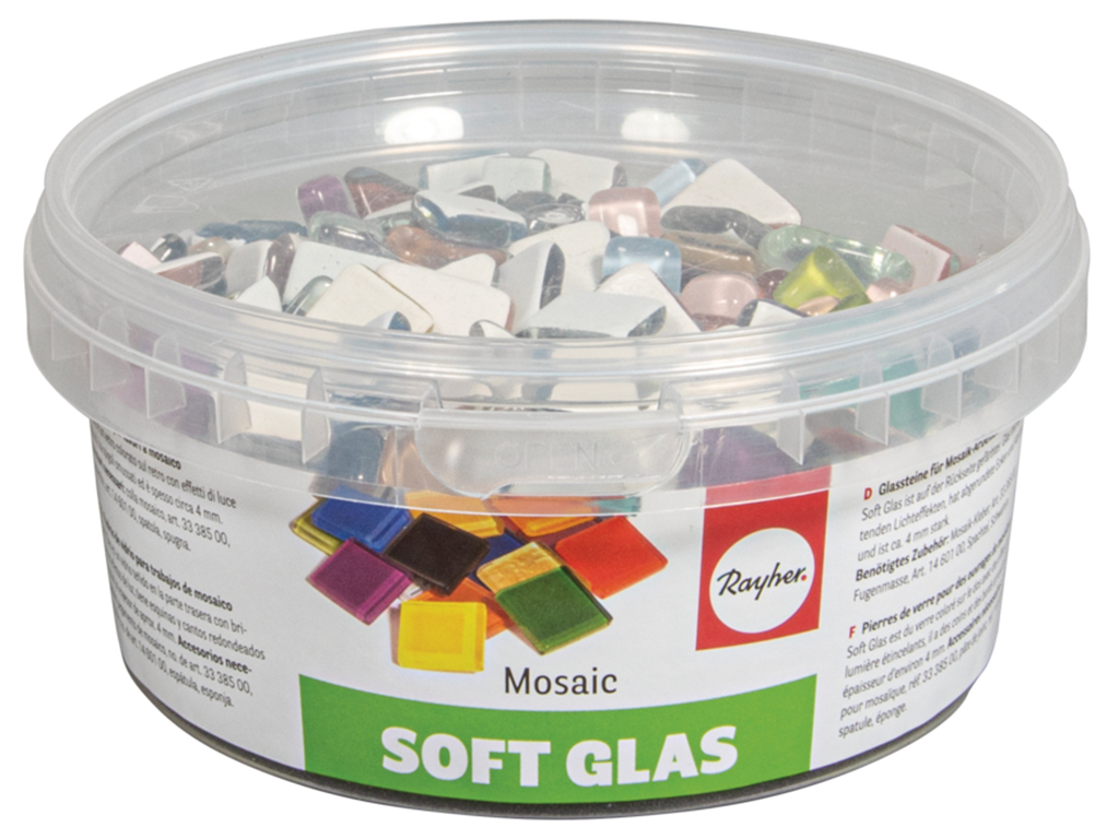 Spalvoto stiklo mozaika „Rayher Soft Glas“ su blizgiu paviršiumi kitoje pusėje. Mozaika yra užapvalintais kraštais ir kampais, maždaug 4mm storio. Ši mozaika yra atspari oro sąlygoms, UV spinduliams ir šalčiui, todėl ją puikiausiai galima naudoti lauke ir žiemą. Iš ryškių ir spalvingų mozaikos gabalėlių sukursite nuostabius raštus. Papuoškite sodo stalus, žibintus ar medinius padėklus švytinčiais mozaikos raštais – galimybės tikrai neribotos!
