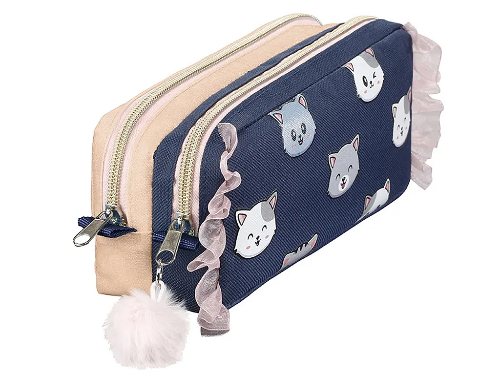 Erdviame, iš aukštos kokybės poliesterio pagamintame penale „Viquel Cats“ yra du dideli užtrauktukais užtraukiami skyriai. Keliuose penalo skyriuose paranku susidėti reikmenis, šios formos penalas yra patogiai pastatomas ant stalo. Lengvas, puikiai tinka naudoti mokykloje ar laikyti įvairius smulkius daiktus.