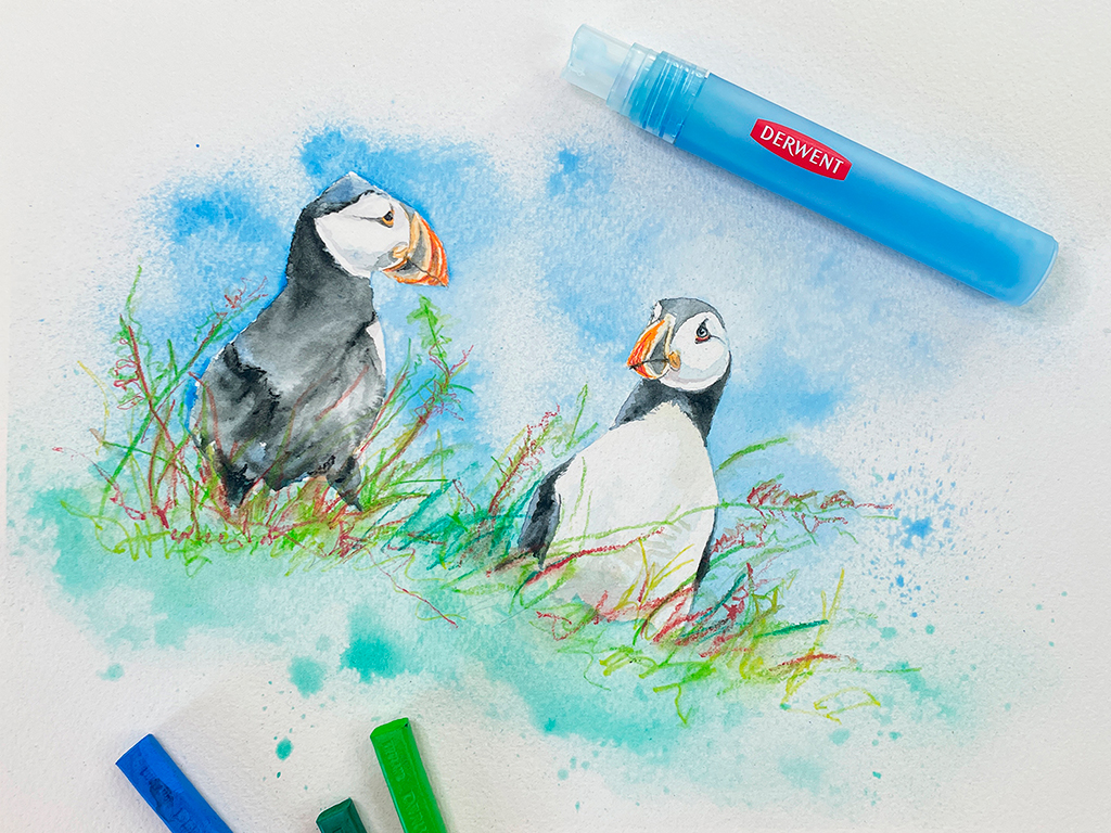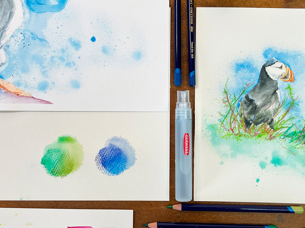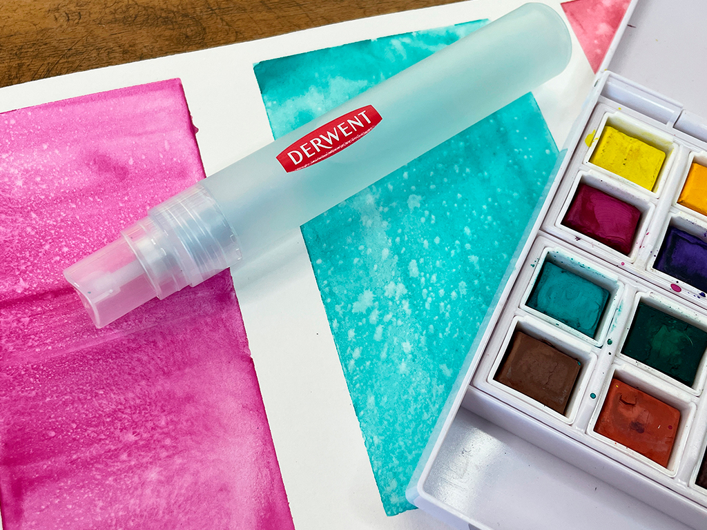 Spritzer smidzinātājs piešķirs jaunas radošā izpildījuma iespējas ar ūdenī šķīstošām krāsām veidotam darbam. Izsmidzini ūdeni tieši uz zīmējuma, kas zīmēts ar ūdenī šķīstošām krāsām, un iegūsi interesantu faktūru, krāsu pārejas un pilēšanas efektu. Vari arī izšķīdināt krāsu pigmentu ūdenī, izmantojot Grate’n’Shake (piemēram, Inktense vai Watercolour), iepildīt šķīdumu izsmidzinātāju un izsmidzināt krāsu tieši uz darba. Daudzi mākslinieki izmanto smidzinātāju mitras darba zonas uzturēšanai.